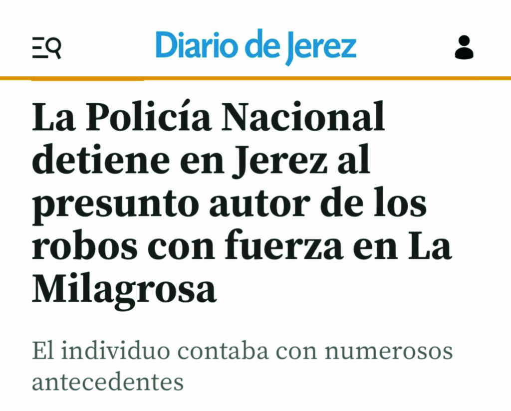 La presión de #VOXJerez da resultados Celebramos que el presunto delincuente ya se encuentre en prisión. Un paso importante para que los vecinos de La Milagrosa puedan volver a dormir tranquilos. Enhorabuena a la